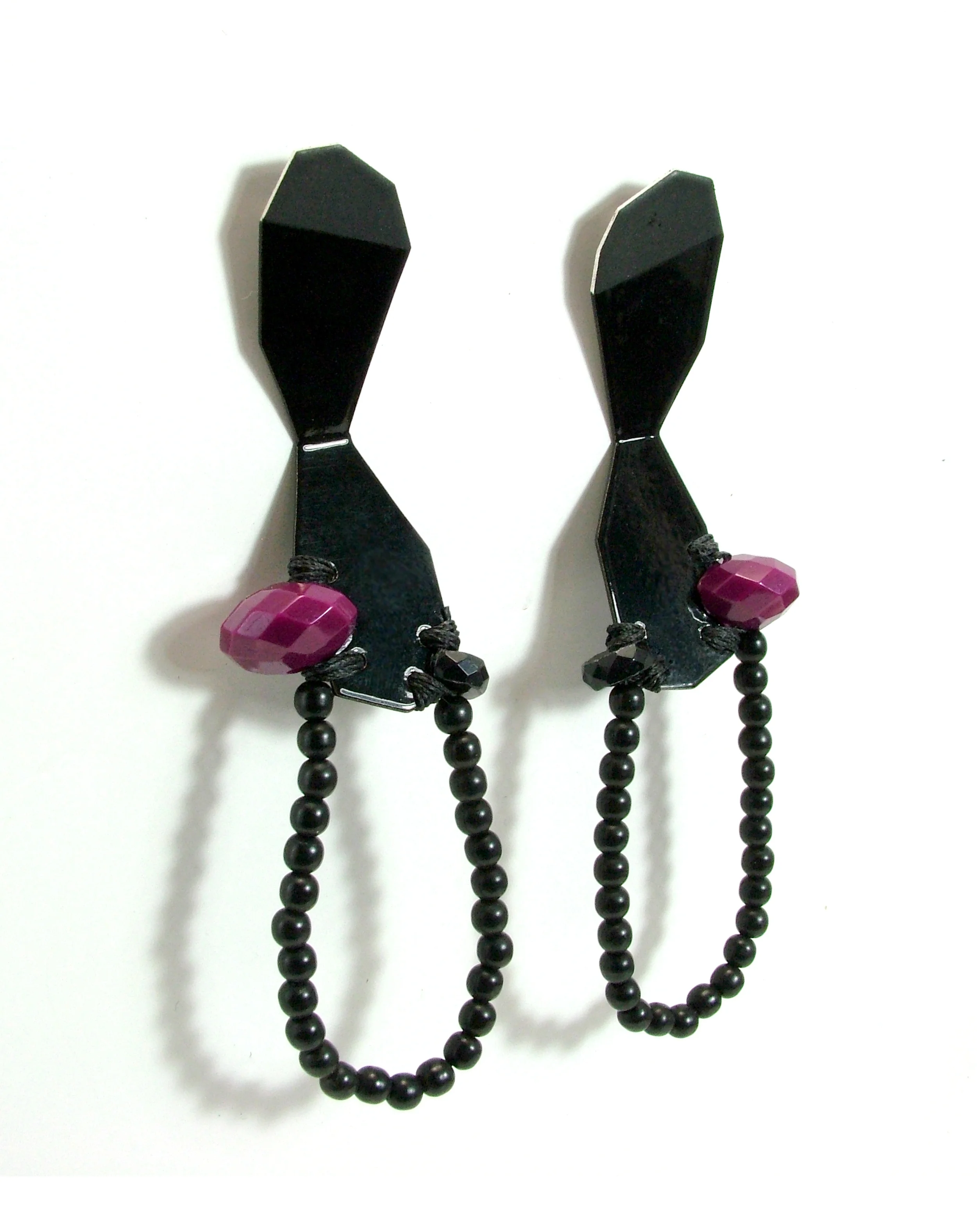 All earrings are made with brass, sterling silver, powder coat, nylon or cotton thread and vintage plastic or glass beads. Please email for availability and pricing.